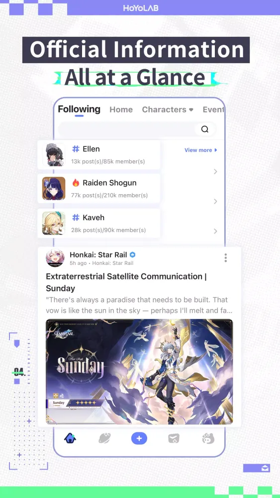 Explore a wide array of content including events, guides, topics, fan art, and more. Whether you're looking for the latest news or tips to improve your gameplay, HoYoLAB has it all. Complete your daily check-ins to earn valuable rewards, join engaging topics, and follow your favorite accounts to stay updated with their latest posts. Searching for specific content that interests you is made easy, and customizing your widget background adds a personal touch to your experience.