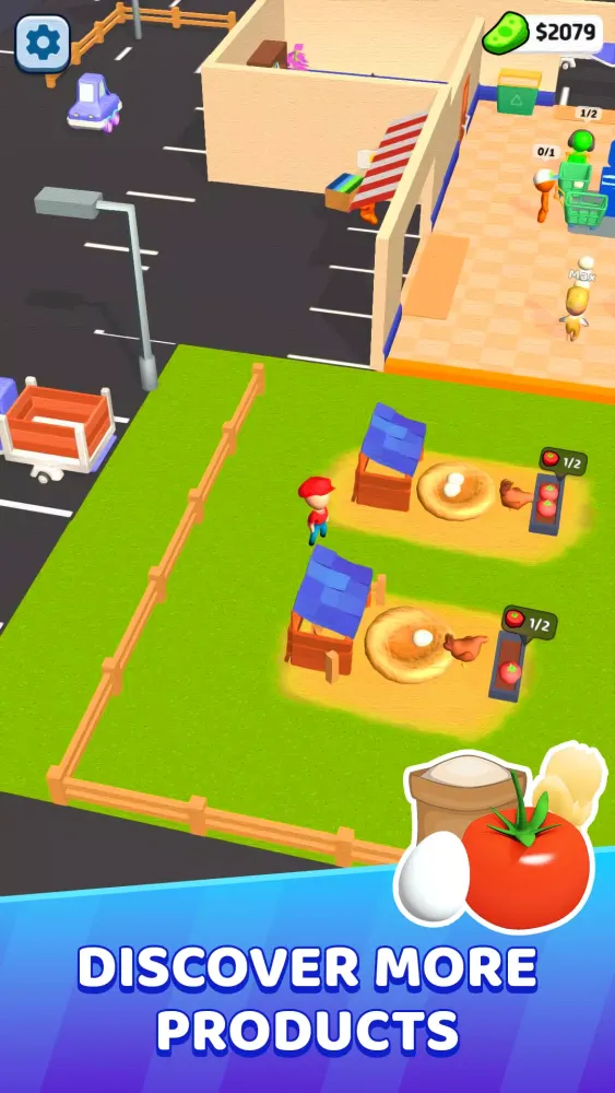 The game introduces a unique twist on traditional supermarket simulations by allowing you to produce the goods you sell. Starting with a small plot of land and a modest store, you can cultivate a variety of crops such as tomatoes and apples. Additionally, you can raise chickens to produce eggs and manage cows to supply milk. Proper animal care is crucial to maximize production, ensuring they are well-fed and healthy.