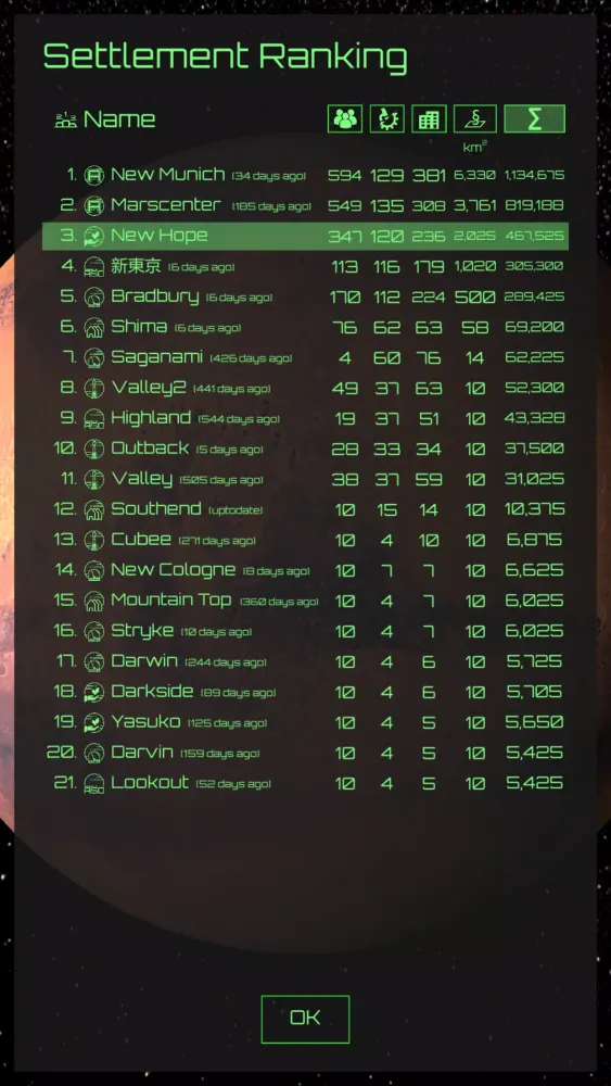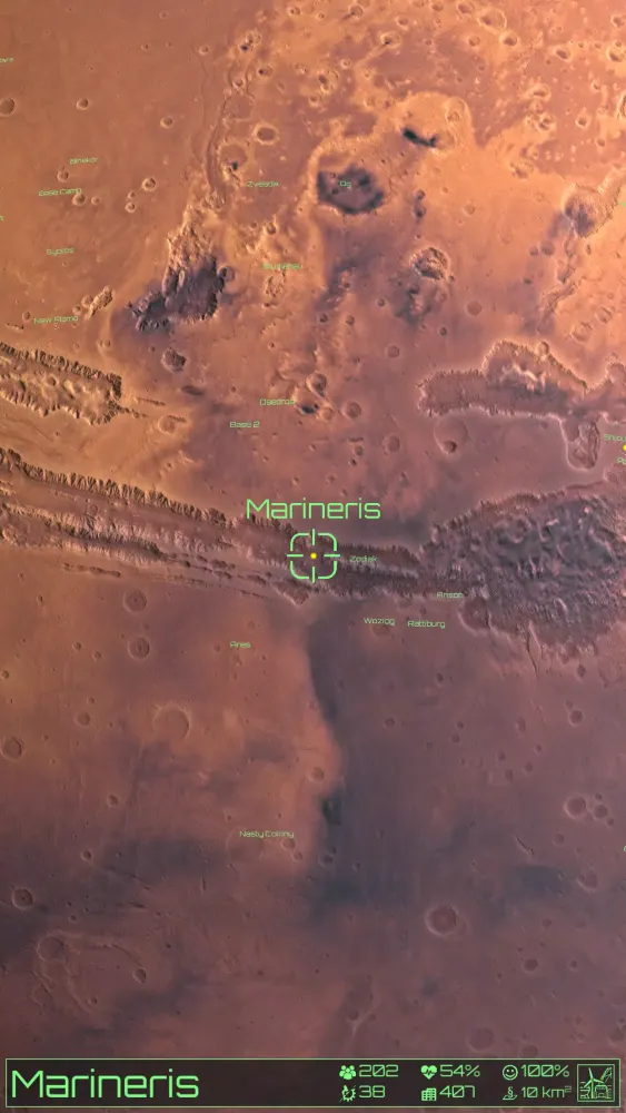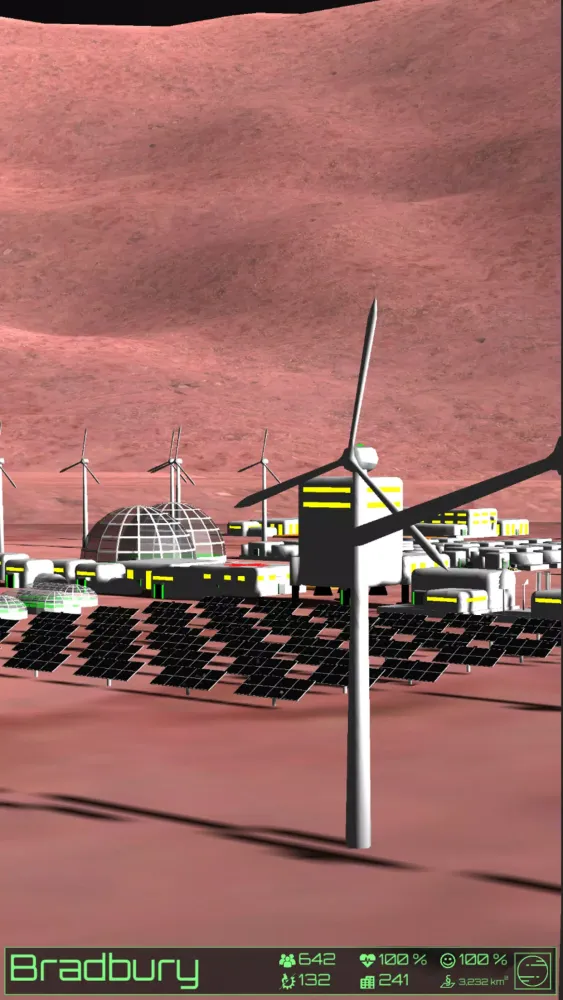 - 3D View: Experience a detailed 3D view of your settlement, complete with authentic Martian topography.