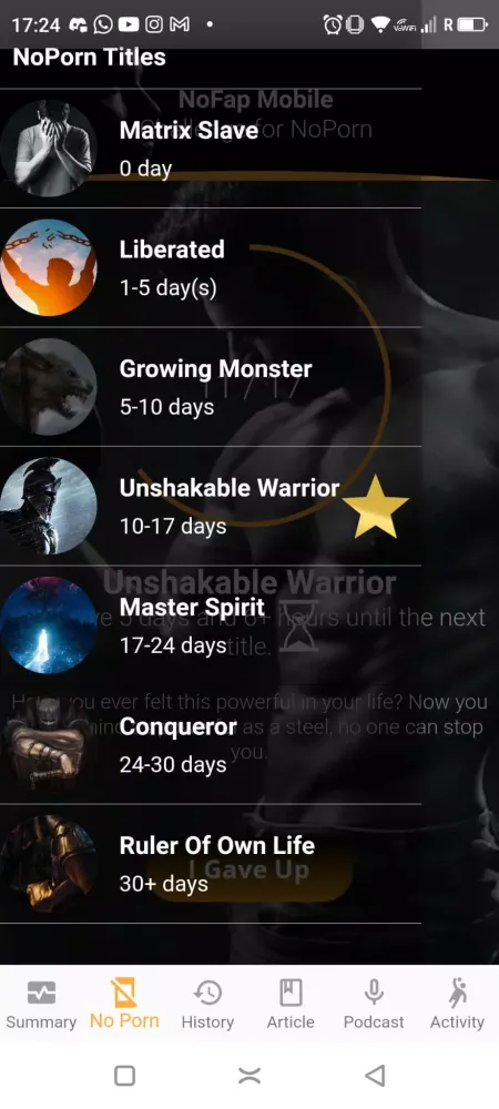 At the heart of NoFap Global lies its ability to empower users through structured activities and personalized challenges. The app encourages you to create daily tasks that align with your goals, fostering discipline and consistency. These activities are carefully curated to help you develop healthier routines while gradually reducing reliance on harmful behaviors. Additionally, the app features a podcast section where you can listen to insightful discussions led by experts in the field. These podcasts cover a wide range of topics, offering practical advice and inspiring stories to keep you engaged and motivated.