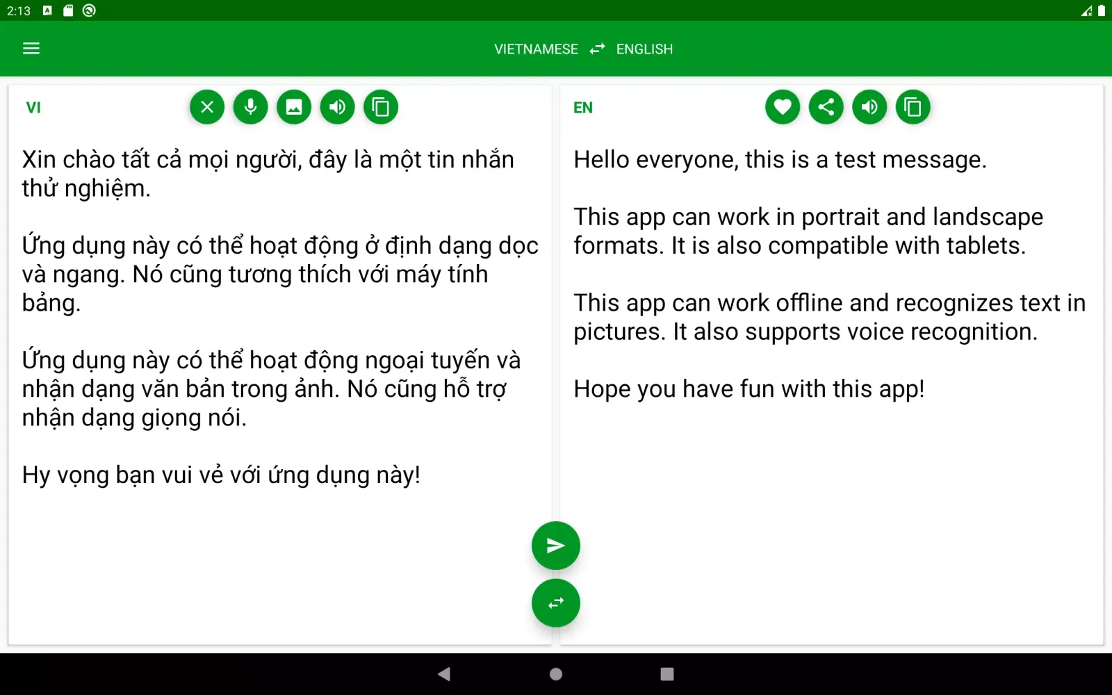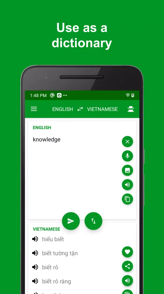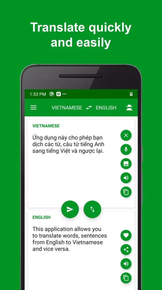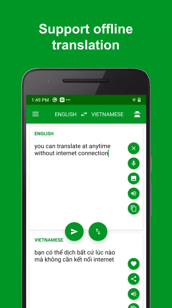 - Voice Support: Listen to translations in either English or Vietnamese. The app supports voice broadcasting, making it ideal for pronunciation practice.