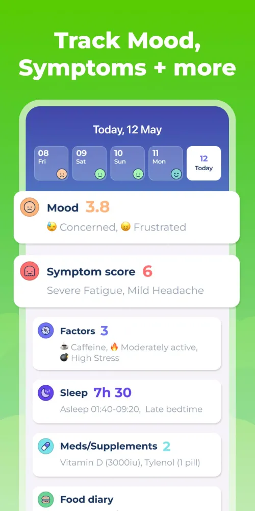 By tracking your symptoms, mood, mental health, and other aspects of your well-being, you can gain valuable insights into what’s helping or triggering changes in your condition. Whether you're dealing with chronic illnesses like PMDD, lupus, bipolar disorder, anxiety, headaches, migraines, fibromyalgia, or depression, our health tracker can help you identify trends and correlations.