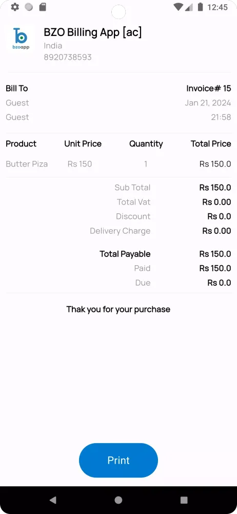 - Printing Options: Share or print invoices in various formats including A4, A5, and 2-3 inch sizes via WhatsApp or thermal printer (USB & Bluetooth).