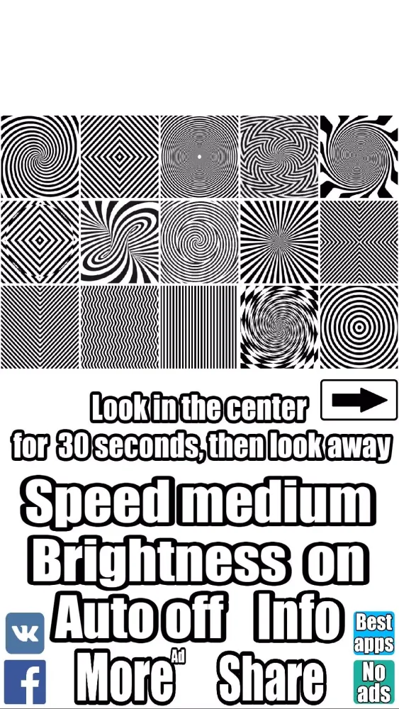 The Illusion application offers a captivating experience where you can explore the fascinating world of optical illusions. By using this application, you can delve into the intriguing ways our eyes and brain can be deceived. Simply select one of the available effects from the main menu and focus on the center for approximately 30 seconds. It is recommended to maintain your gaze without looking away during this period. After the duration has elapsed, observe any object around you; you may notice some unexpected visual alterations.