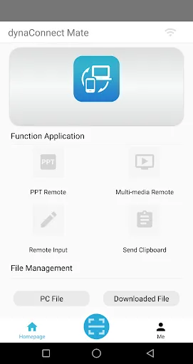 dynaConnect Mate supports sharing files between PC and smartphone, sharing a clipboard, operating presentation and media player on the PC from smartphone, entering text from smartphone to PC, operating smartphone with PC keyboard and touchpad, etc. The functions that can be used differ depending on the smartphone.
