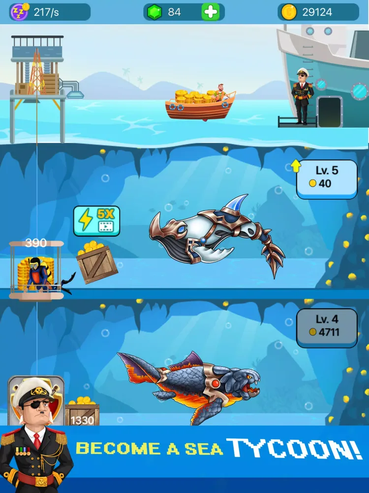 Interact with your pet sea monsters to boost their productivity. Train them to work autonomously or guide them through battles. As you progress, upgrade your sea monsters to make them bigger, stronger, and more powerful. This will not only enhance their ability to mine gold but also prepare them for thrilling battles against other sea monsters.