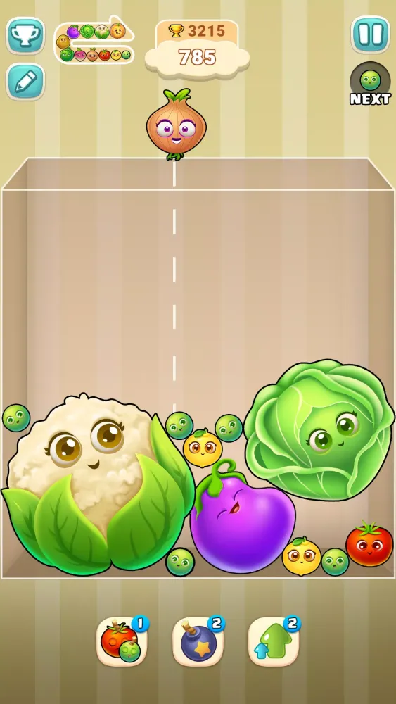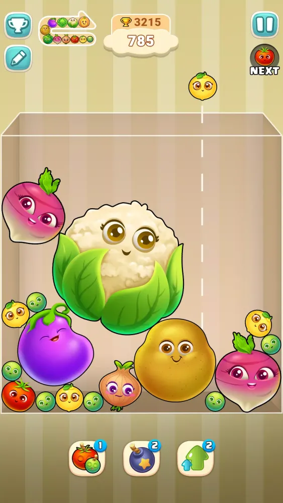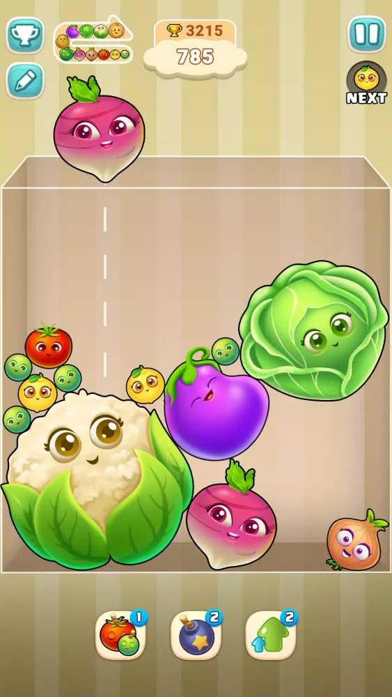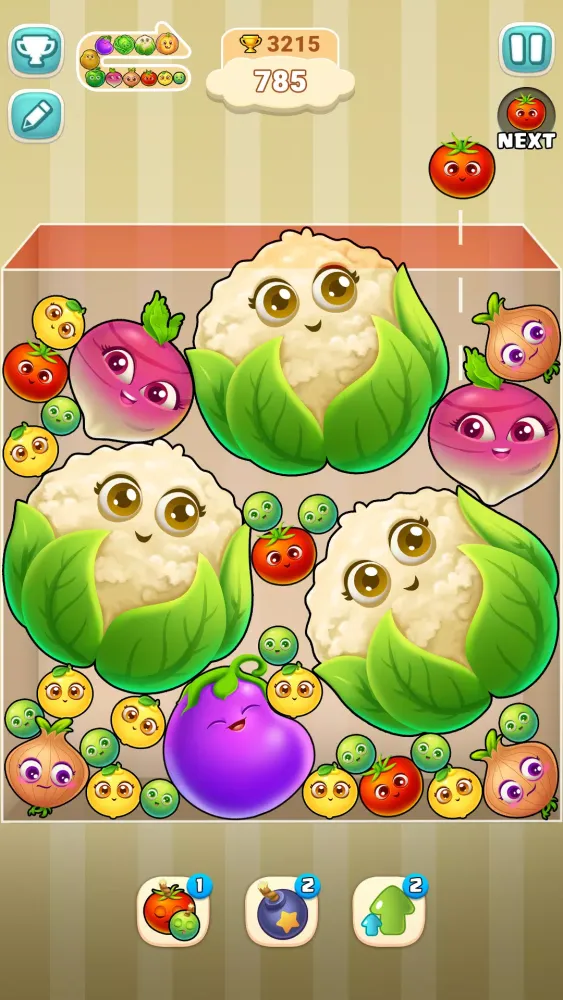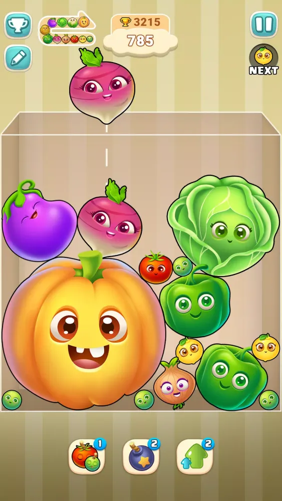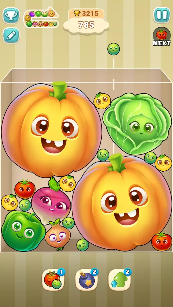 Start by merging matching vegetables to cultivate the biggest, most mesmerizing pumpkin you've ever seen! 🥕✨ Each veggie begins small, but with a bit of strategic planning, they transform into larger, more charming versions that fill your container with vibrant colors and joyful smiles.