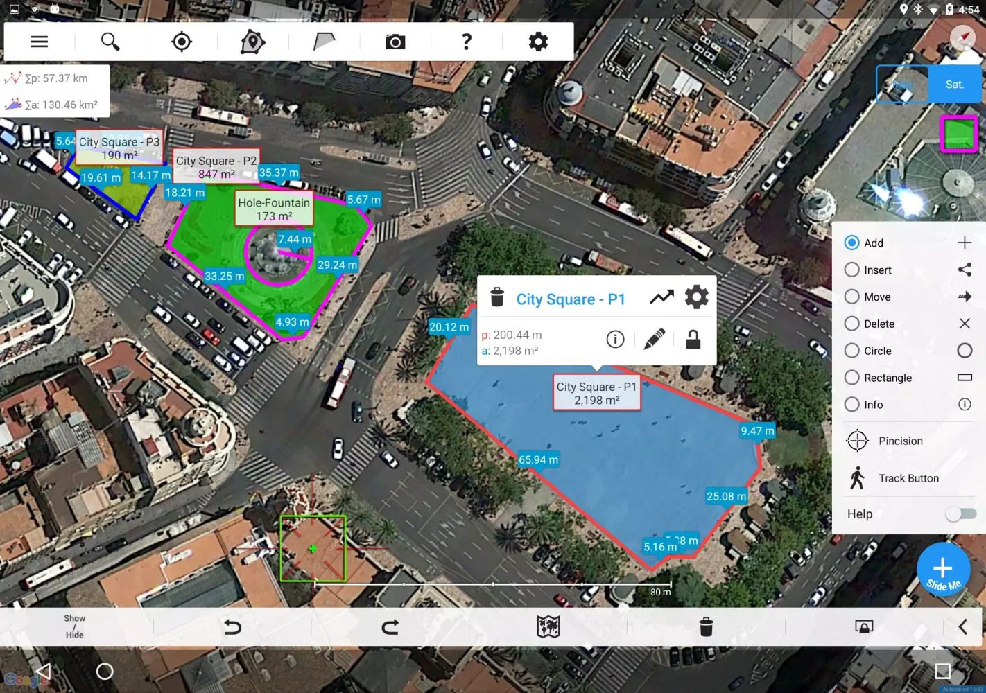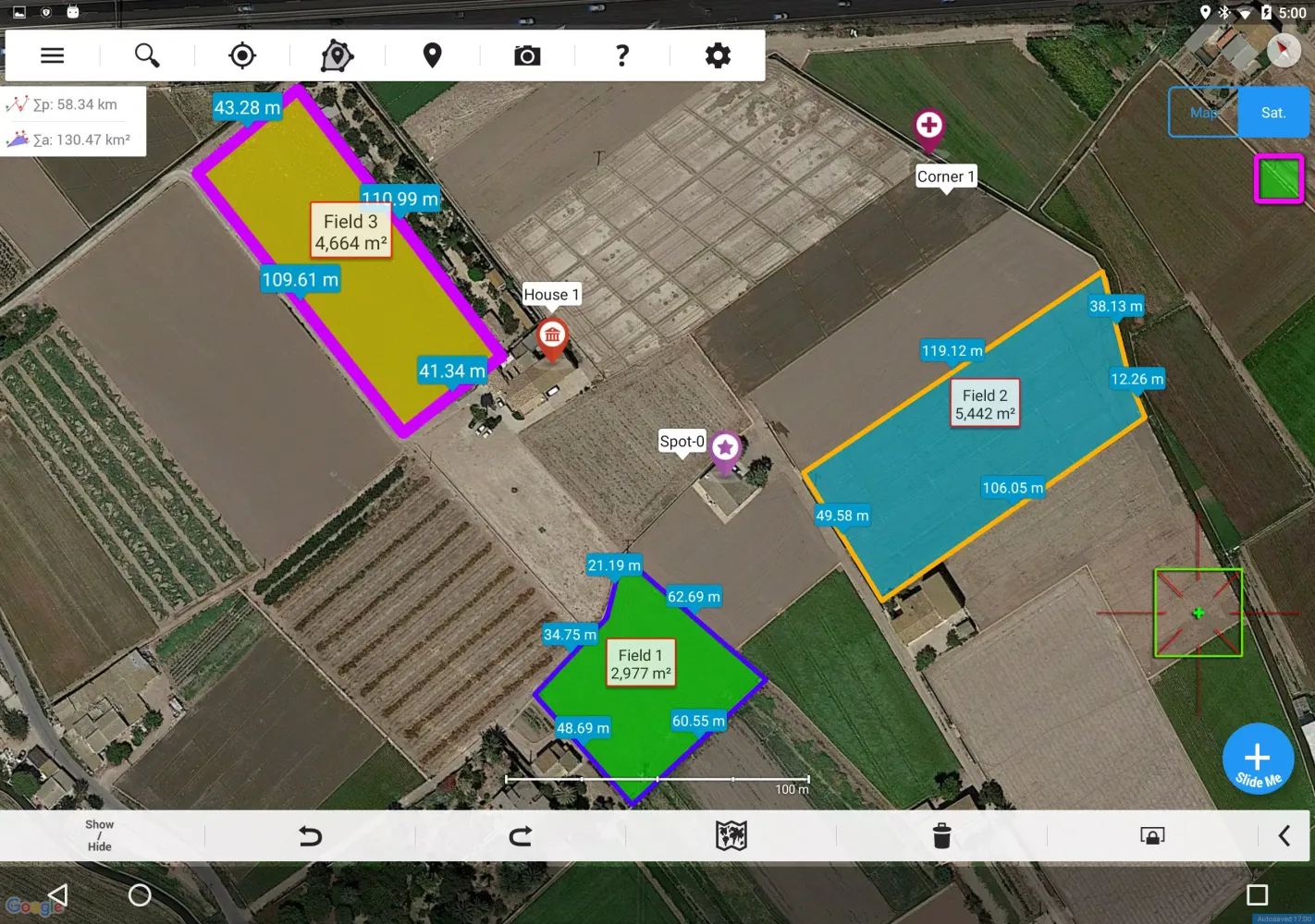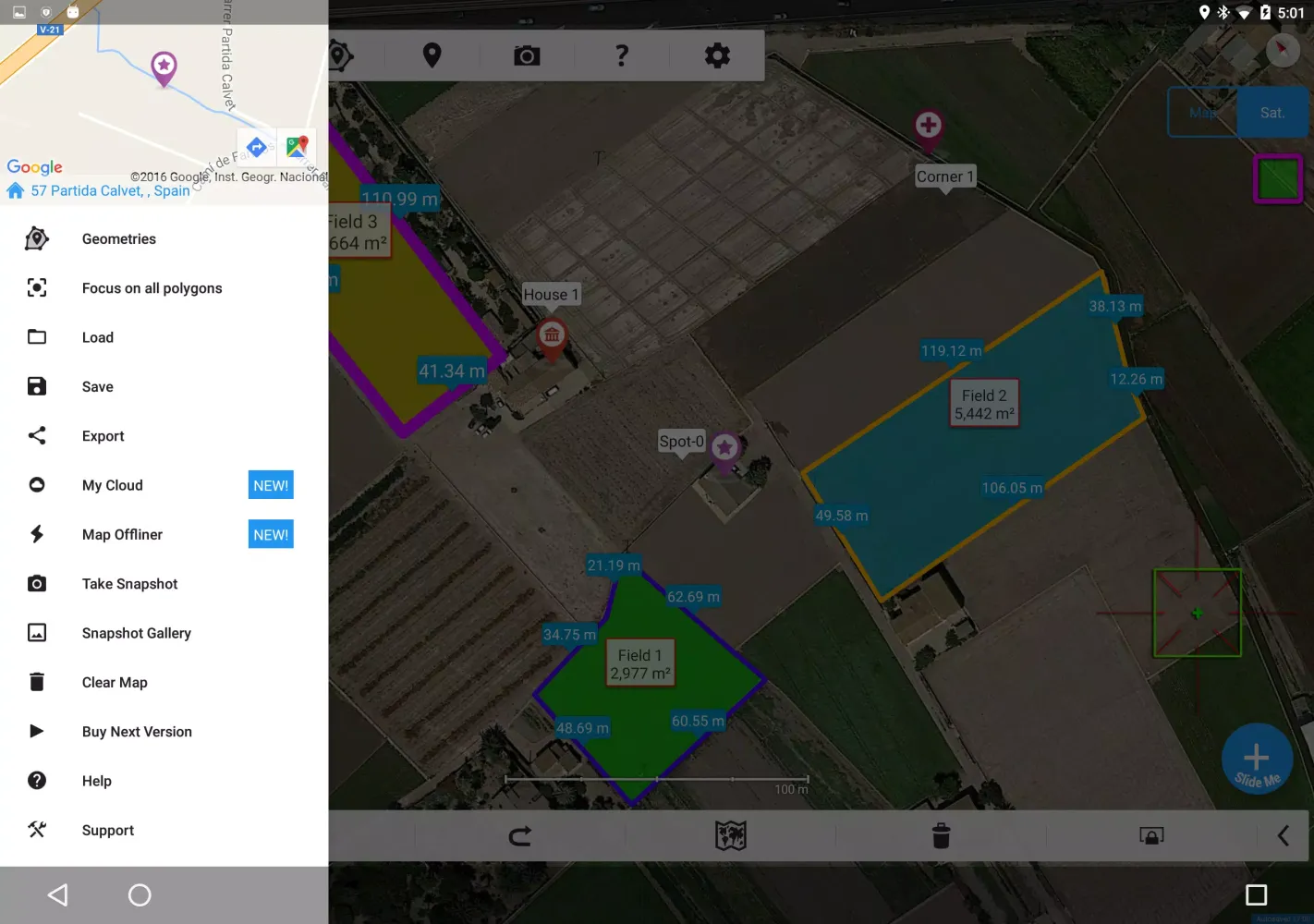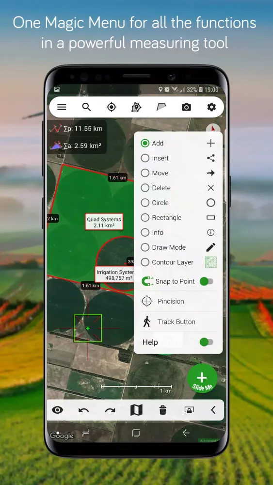Layered Display Options: With various display options, you can toggle between satellite imagery, normal maps, and terrain views to enhance your measurement experience.
