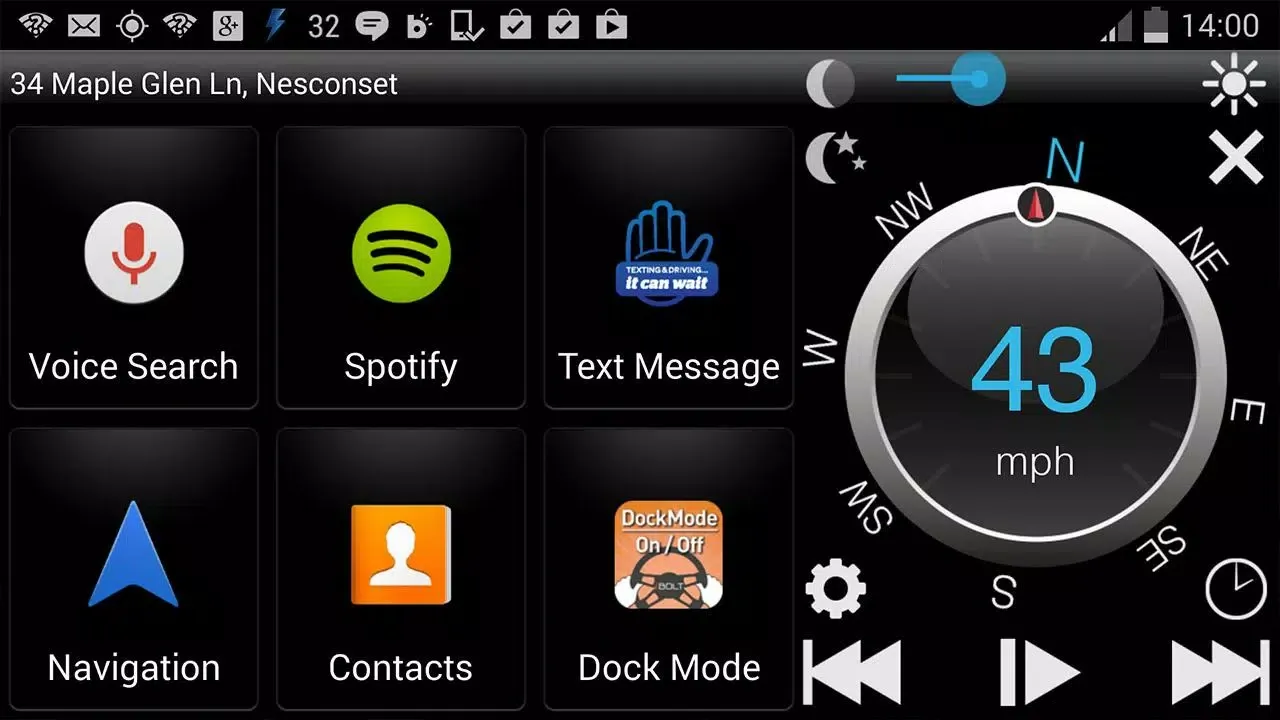 The “Dock’n Drive” application will change the way Android Smartphones are used while driving. 18 tiles can be set as short-cuts to frequently used apps, favorite contacts etc. In full screen mode a gorgeous digital speedometer, an innovative “compass ring” and media play buttons optimized for Pandora, Spotify, TuneIn, Slacker etc. are seen.