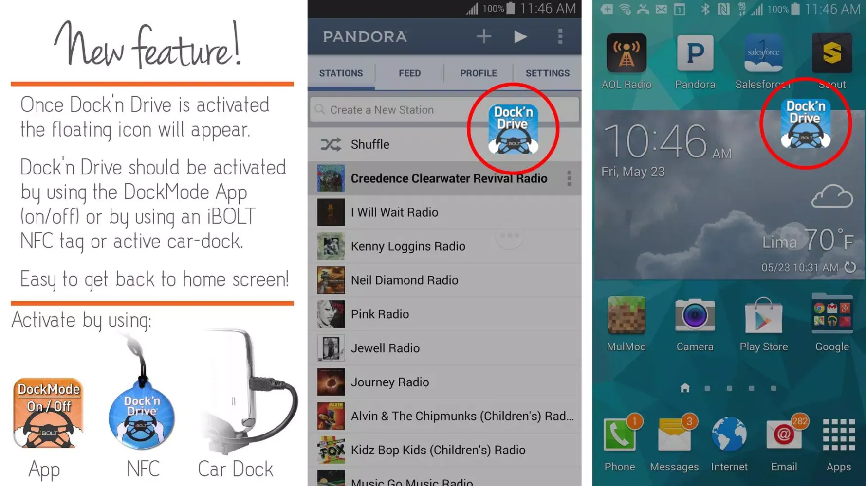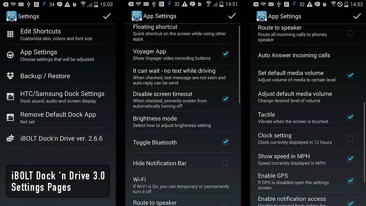 The “Dock’n Drive” application can be set to automatically launch and install as your new “dock home screen”. When inserting the HTC or Samsung handset into an iBOLT Dock Bluetooth is turned on, Wi-Fi turned off and screen time-out is disabled. (Leave "GPS" always on as it does NOT drain battery).