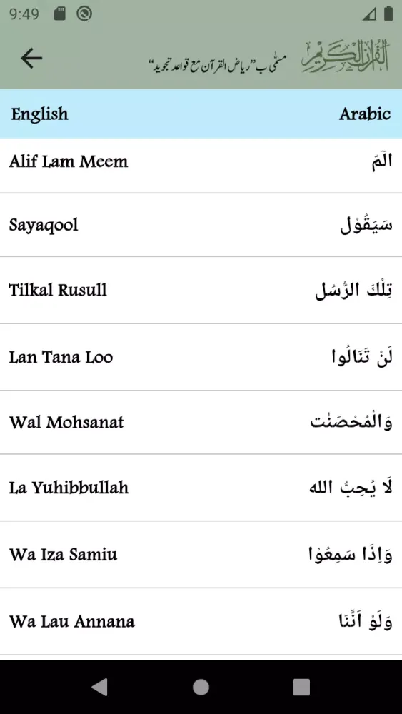 - Sura'h List: Directly access any Surah by selecting it from the Surah list.