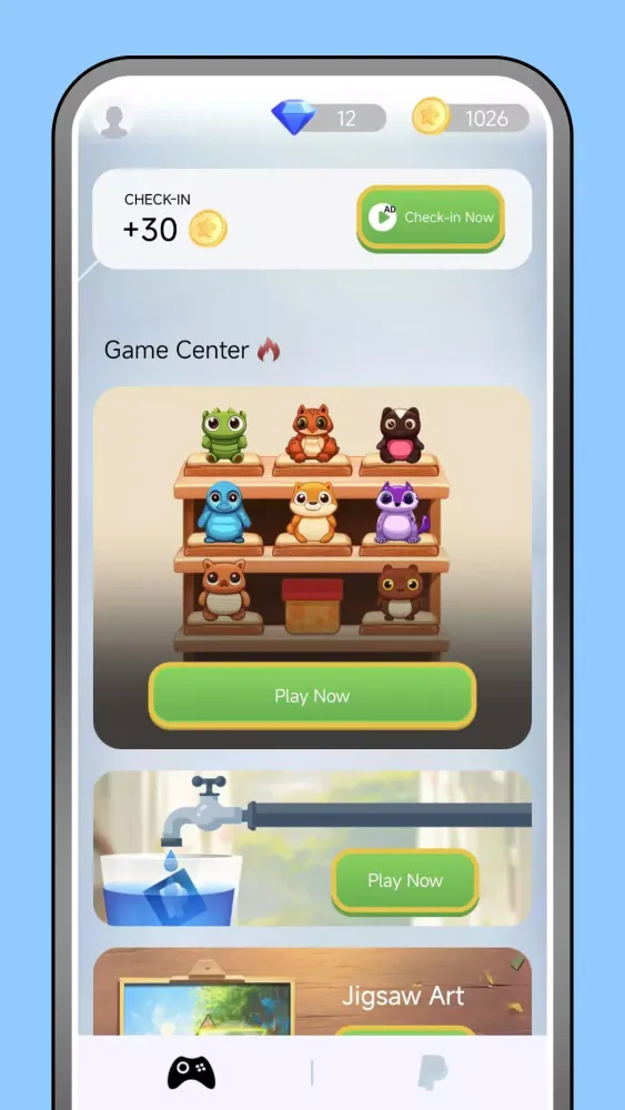 Dive into the Game Center where you can enjoy a variety of exciting games. Each game played contributes to your earnings, making it both entertaining and rewarding. Additionally, regular CHECK-IN and SPIN activities ensure you have multiple opportunities to boost your rewards.