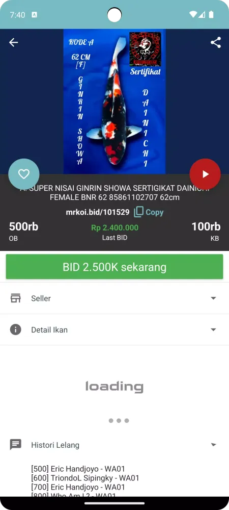 Sellers can effortlessly enter auction fish photos and videos independently, eliminating the need for server setup or specialized equipment. Registration is free, and the BOT fee is proportional, offering a significant advantage for koi businesses. Existing WhatsApp/Telegram groups can be utilized, and the platform supports Keeping Contest and Azhukari events, as well as relay auction modes.