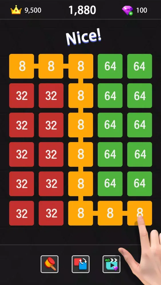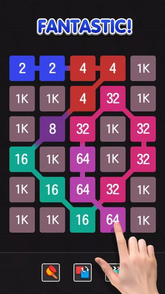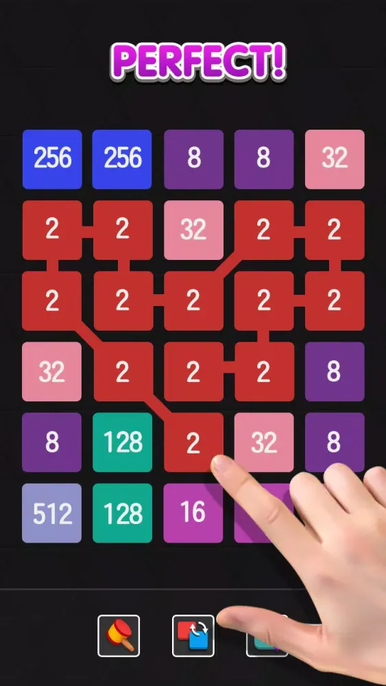 In this game, your objective is to connect numbers and achieve the highest possible score. You can merge identical numbers in all eight directions: up, down, left, right, and the four diagonal directions. For example, after merging two '2's to form a '4', you can continue merging this '4' with another '4'. The sequence continues as follows: 2.2.4.8... can be merged into a '16'. Additionally, there are free power-ups available to assist you in achieving higher scores.