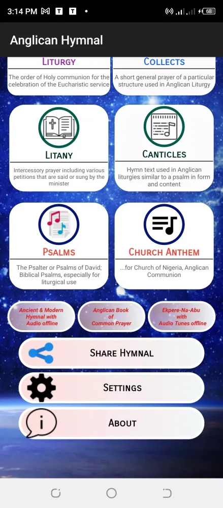 - **Search Functionality**: The Anglican Hymn App is equipped with a robust and fast search engine, allowing users to find hymns by title or number effortlessly. - **Comprehensive Content**: The app contains hymns, collects, litany canticles, and spiritual songs. - **User-Friendly Features**: Includes sharing options and other performance enhancements for easier use. - **Offline Access**: The app supports offline usage, ensuring hymns are accessible even without internet connectivity. - **Seamless Reading Experience**: Offers an automatic, steady display while reading, searching, or singing hymns.Join us in celebrating the richness of Christian worship through this powerful and user-friendly application.