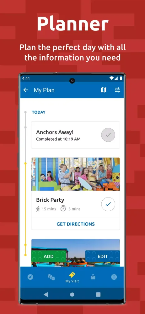 - Planner Tool: Plan ahead and make the most of your visit. Add your favorite rides, attractions, and shows to your itinerary. The planner also helps you determine which rides are suitable for everyone in your group.