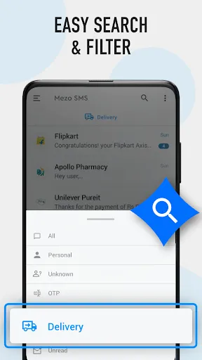 - Messages are sorted & organized intelligently. Easily see useful & promotional SMS in separate tabs. You can further filter messages based on Personal, Unknown, Transactions, Delivery etc.