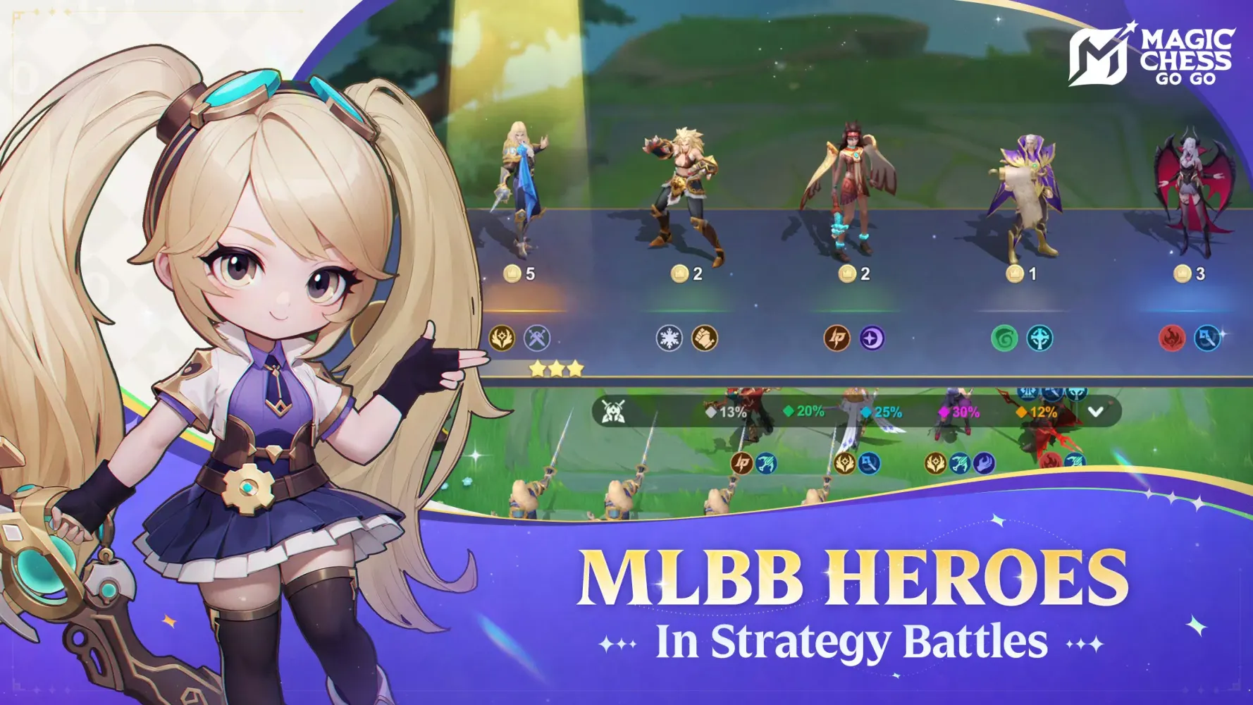 Magic Chess: Go Go (MC GOGO) is a dynamic real-time multiplayer strategy game that combines the timeless appeal of classic chess with the engaging mechanics of RPGs and MOBAs. Drawing inspiration from the immensely popular Mobile Legends: Bang Bang (MLBB), this game offers a fresh take on traditional chess by introducing elements like auto-battle mechanics and strategic hero management. Whether you're a seasoned chess enthusiast or new to the world of strategy games, Magic Chess: Go Go provides an immersive experience that challenges both your tactical acumen and adaptability.