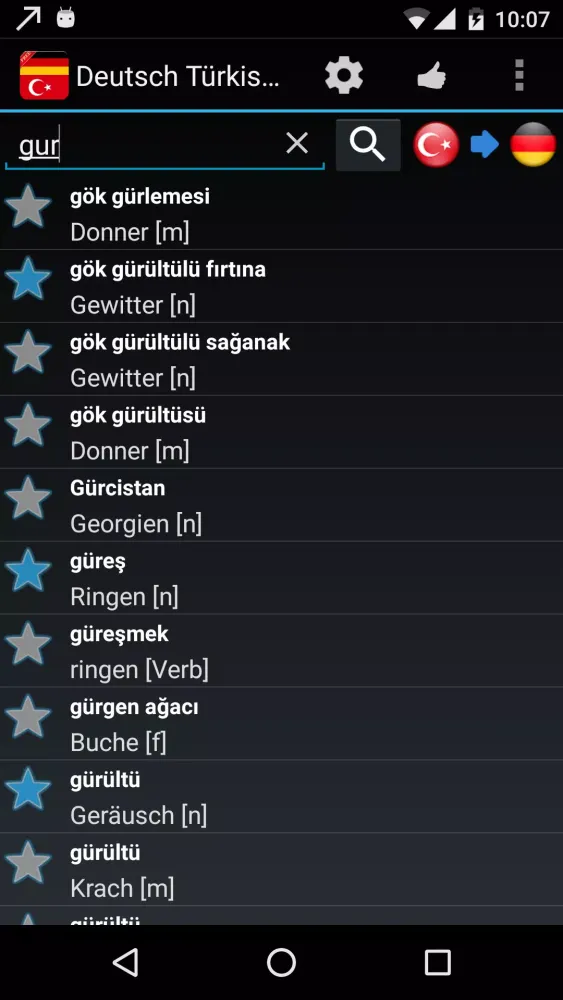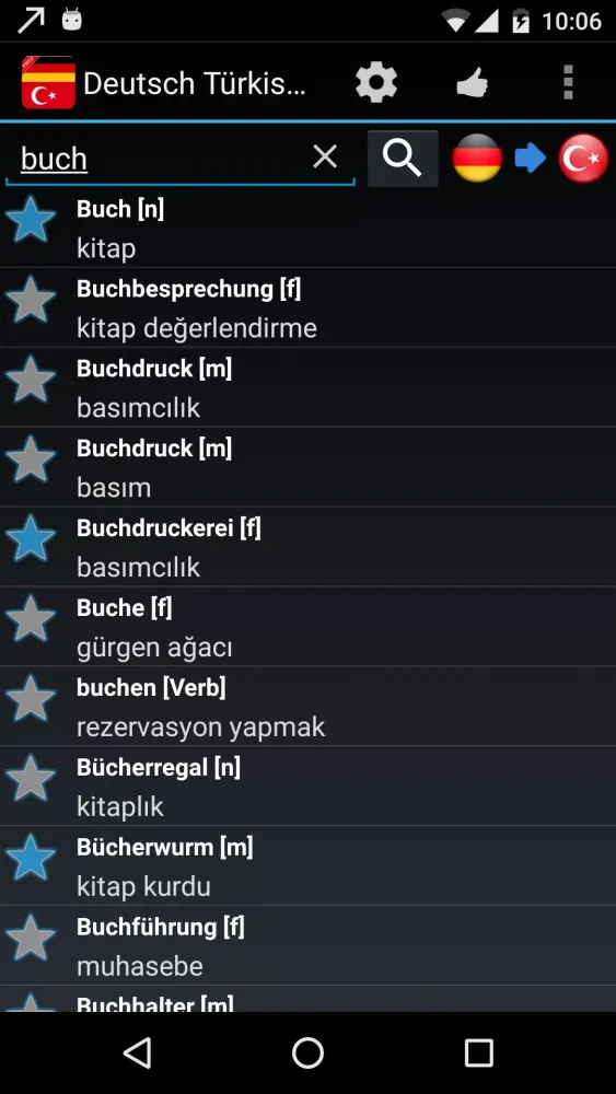 - Listen to Pronunciations: Use Android's built-in Text-to-Speech synthesizer to hear the correct pronunciation in both Turkish and German.