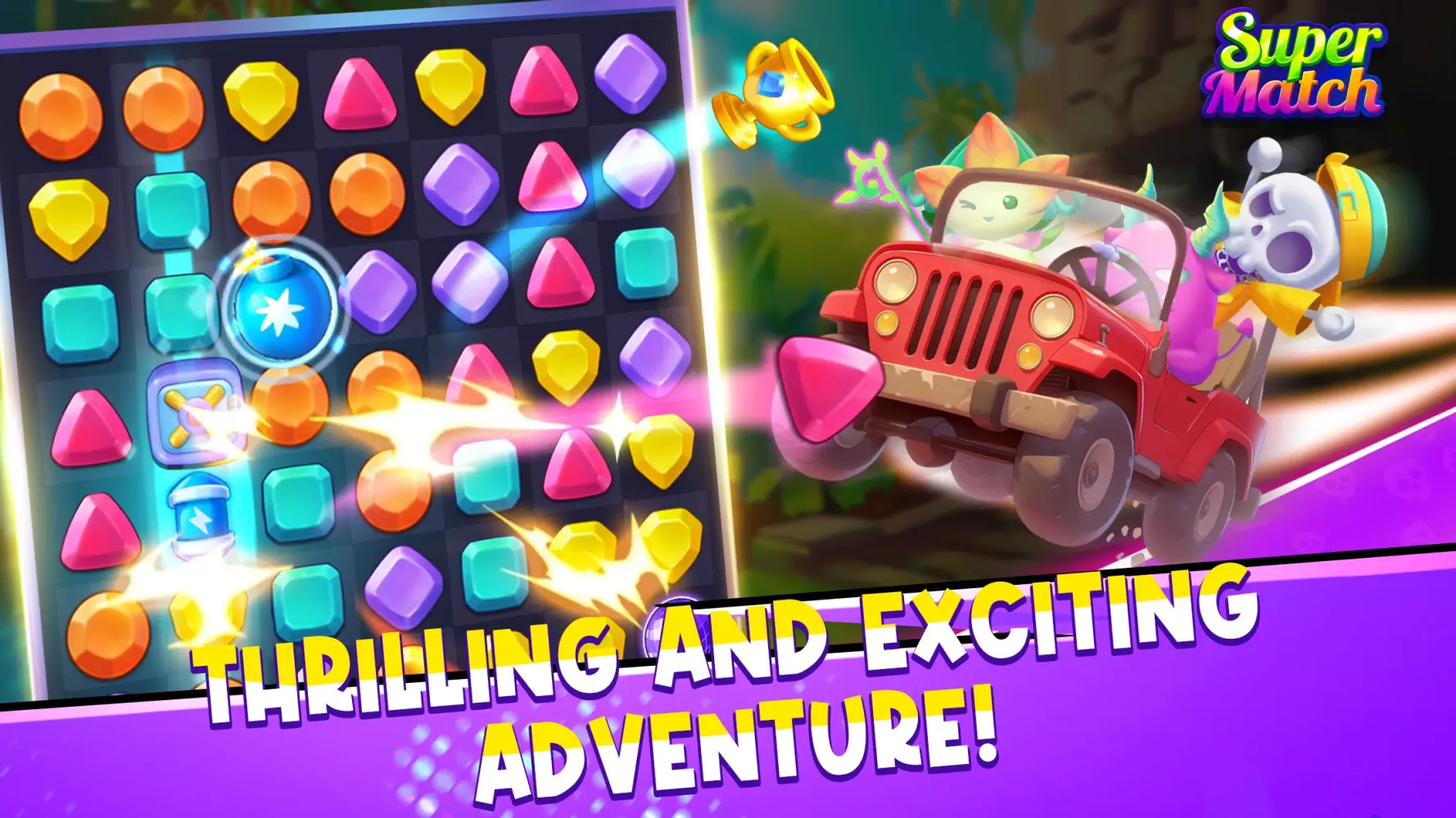 Do you need something fun to do with your free time? Want to play match-three games? Get ready to embark on an exciting journey with Super Match! Dive into the universe of match-3 adventure games and free puzzles that will keep you entertained for hours. Enjoy the thrill of dynamic match-3 gameplay and the strategic depth of Blast games. Challenge yourself to become the ultimate Super Match king and play with millions of happy players in this online multiplayer experience.