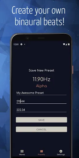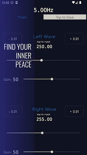 You can generate and save your own frequencies using two independent oscillators, controlled by two horizontal bars, with fine adjust buttons or directly by input the desired value you want (tap the left or right frequency value to open the input dialog).