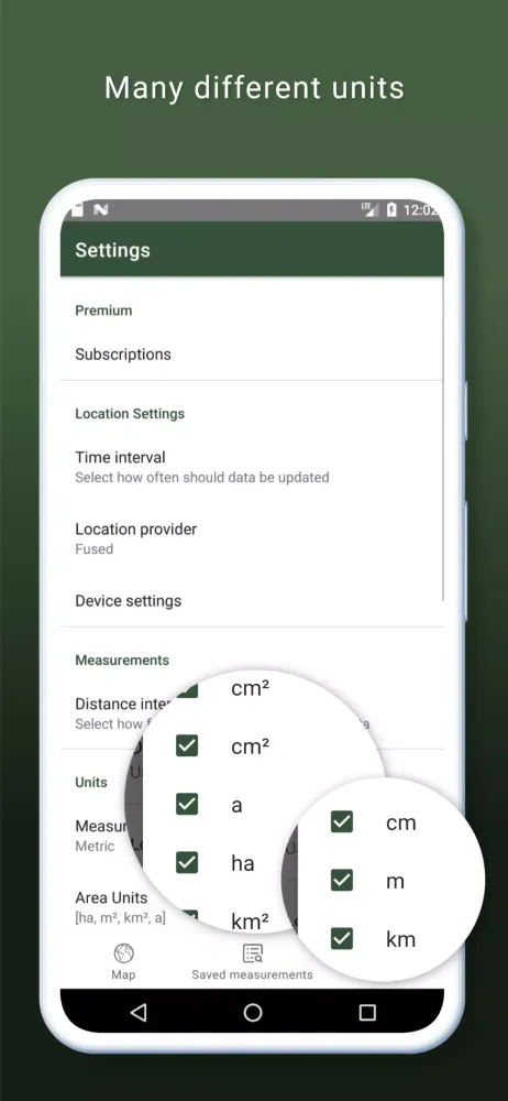 - Field area measurement in meters², kilometers², feet², nautical miles², yards², and acres.