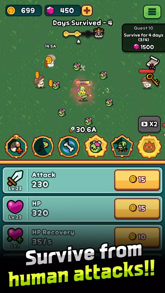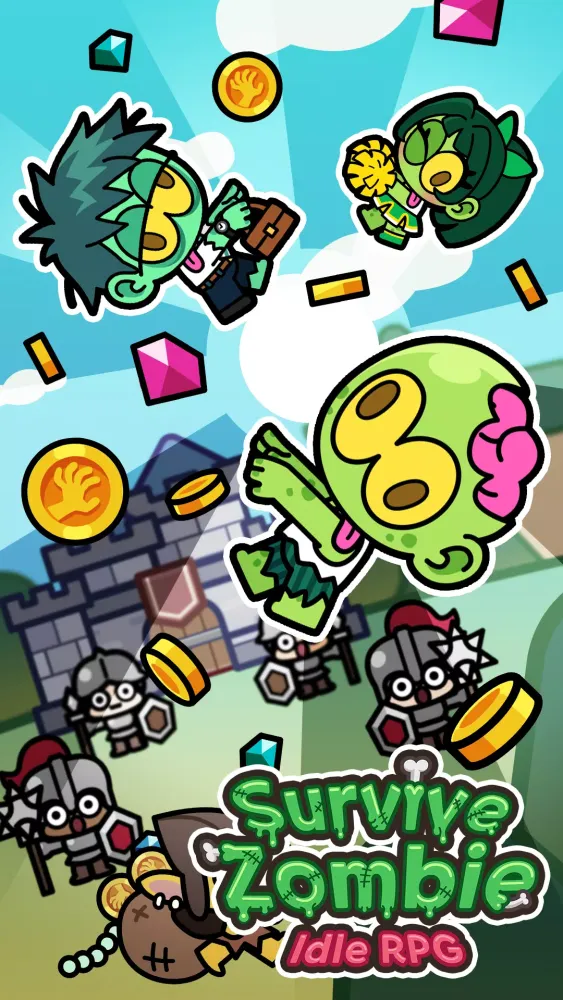 - Idle RPG Mechanics: Collect coins by defeating enemies that threaten the kingdom. These coins can be used to enhance your zombie army, making them stronger and more resilient.