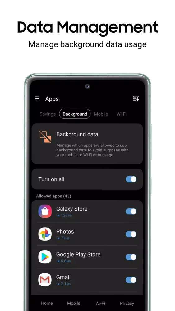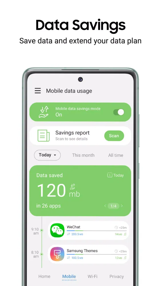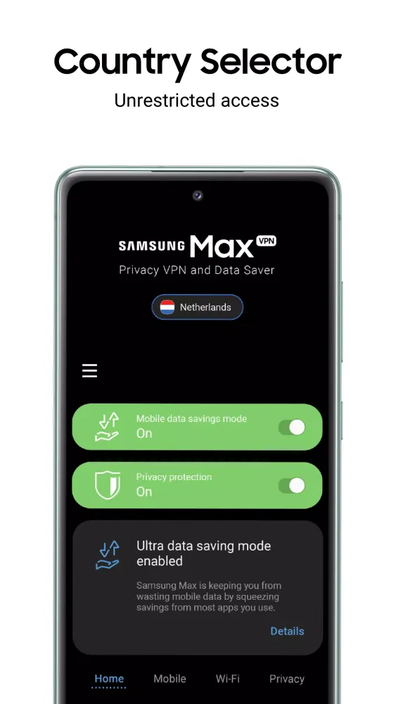 When you activate data saving or privacy modes, Samsung Max compresses and encrypts your app's network traffic before it reaches your Android device. This ensures a secure connection, even on public Wi-Fi, and maximizes your data efficiency.