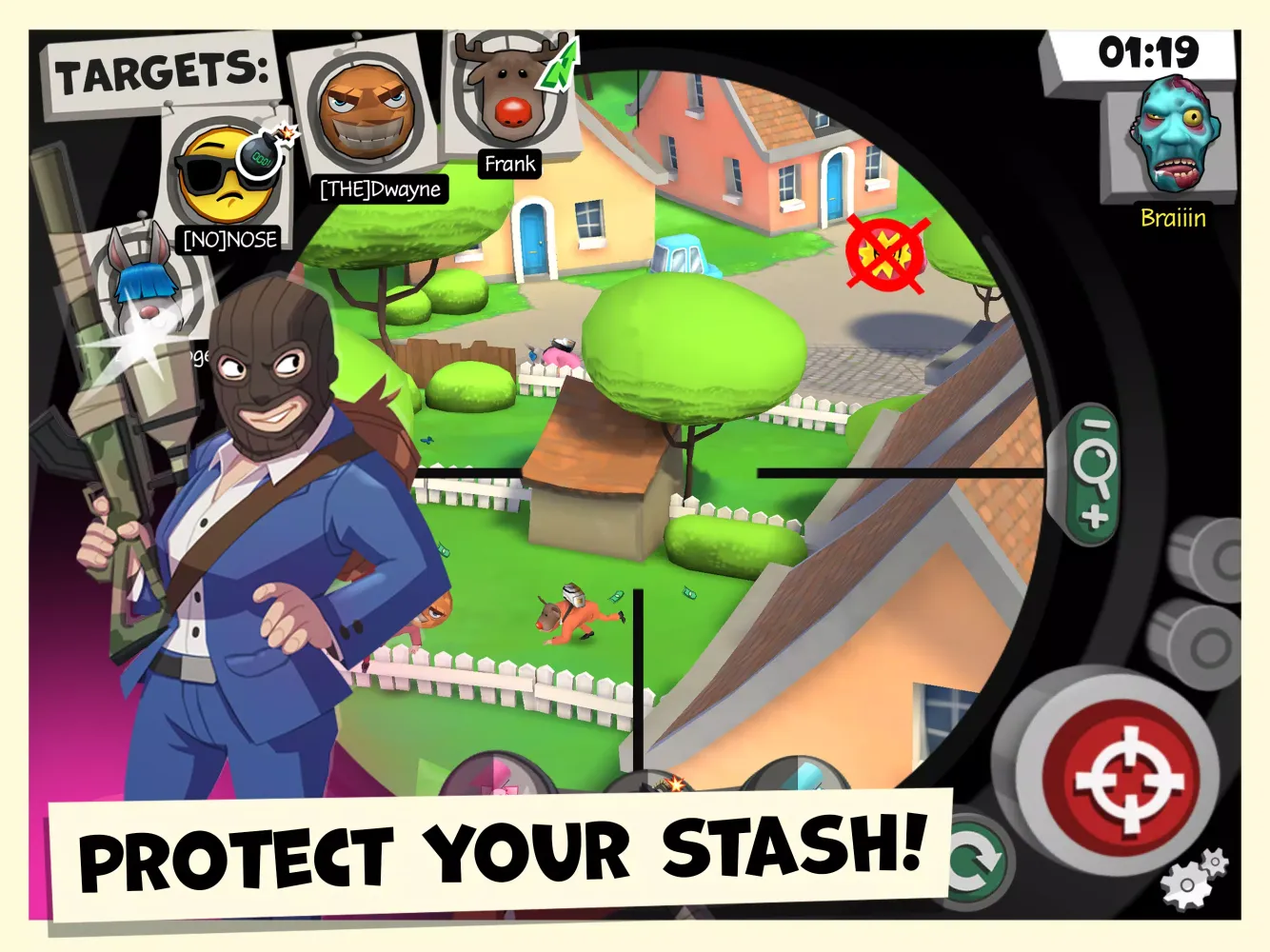 - Protect Your Vault: Defend your stash from rival bankers in real-time. Take them out before they reach the getaway van!