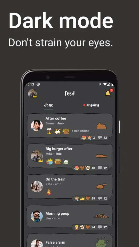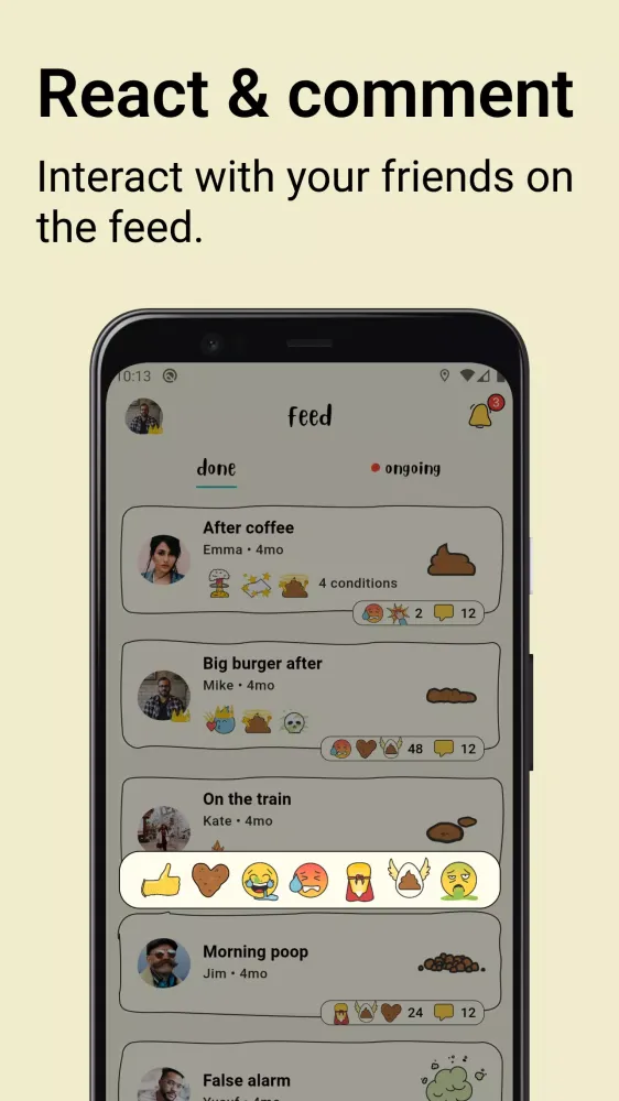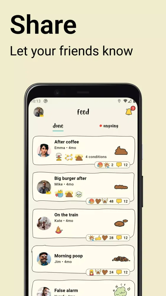 Connect with friends by sharing your poop updates on the feed. Follow each other, react, and comment on your friends’ poops to build a fun, interactive community around your daily habits. Sharing your experiences can be both entertaining and informative, fostering a sense of camaraderie and shared interest.