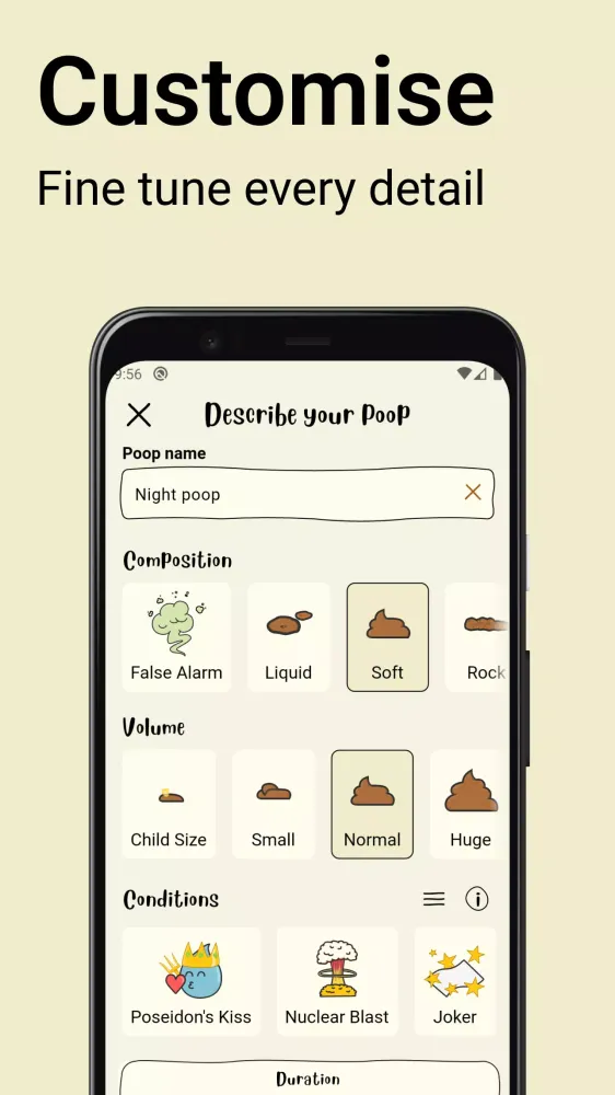 Easily log your bowel movements in real-time or add them later. Personalize each entry by giving your poop a unique name, adding notes, and specifying size, type, and color. You can even include fun conditions like “smelly,” “spicy,” or “blockage” to make your poop truly one-of-a-kind! This level of detail not only adds humor but also helps you gain insights into your digestive health.