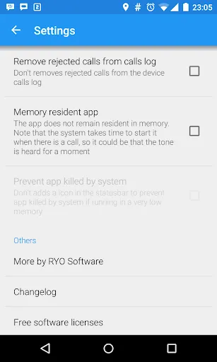 Note that the app is started when the call is received. Due to that, is possible that the system starts the incoming call ringtone before the app ends it. If that occurs, please, create a ringtone with 1-2 seconds of silence and use it.