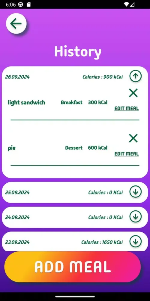 One of the most useful features of the app is the "History" tab, where you can review your past achievements. This tab provides a detailed look at how your results have evolved over time, allowing you to track your progress and draw meaningful conclusions about your nutritional habits. Understanding how different meals impact your body can help you make informed decisions and stay on track toward achieving your goals.