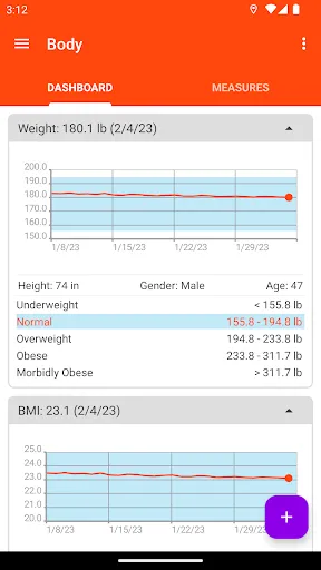- Calculation of BMI, and body fat WHtR with individual analysis over a period of time.
