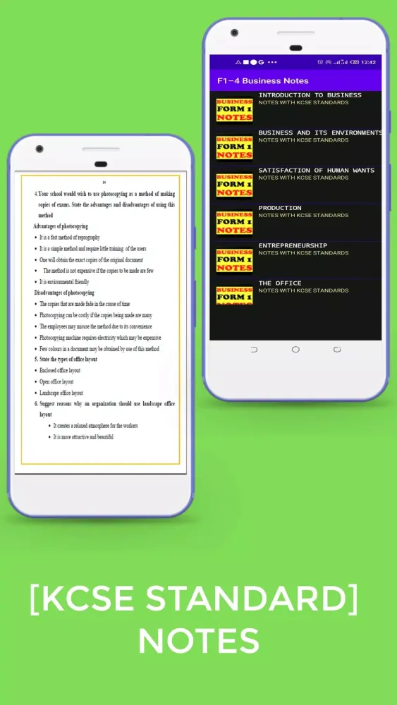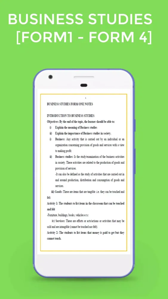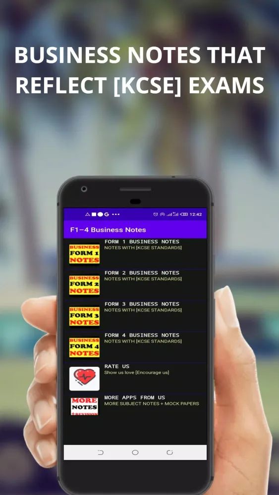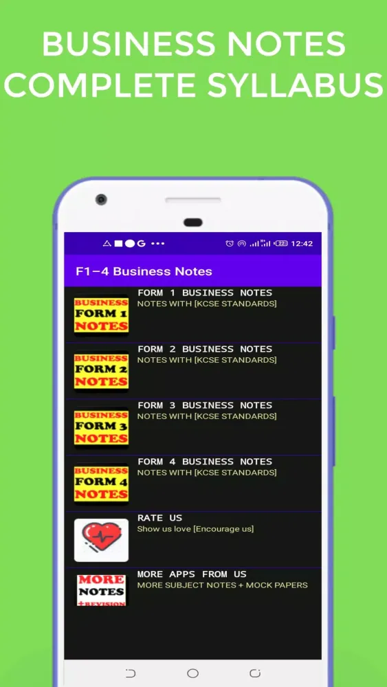 In summary, the "Business Studies F1-F4 Notes" application is a valuable resource for anyone involved in secondary education. It provides a complete package of study materials that adhere to KCSE standards, ensuring thorough preparation for exams. The user-friendly language, coupled with its portable nature, makes it an indispensable companion for both students and teachers. Download it today and take the first step toward achieving academic success!