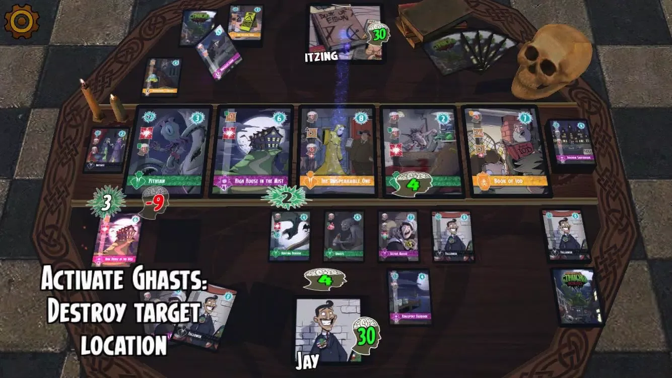 Gameplay in Cthulhu Realms is straightforward yet engaging. Each turn starts with a hand of five cards, which players use strategically to deploy locations, manipulate sanity levels, accumulate conjuring power, and eliminate unwanted cards. Locations provide special abilities that can be activated once per turn, adding layers of strategy to each move. Players must carefully balance their resources, as losing all sanity results in elimination, while the last remaining sane player emerges victorious. Alternatively, if the deck runs out before anyone loses their mind, the player with the highest sanity wins.