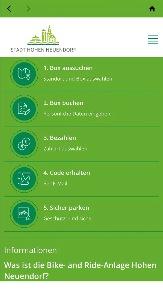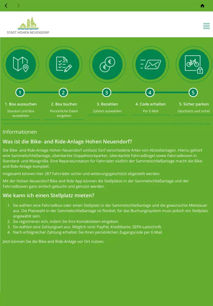 The Hohen Neuendorf Bike and Ride is an innovative electronic booking and access system designed specifically for secure bike parking facilities. This application streamlines the process of reserving and accessing bicycle parking spaces, ensuring convenience and security for all users.