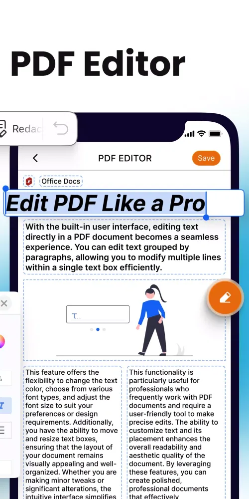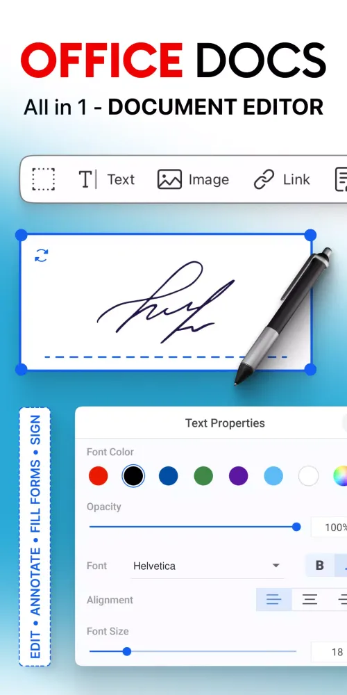 With Office Docs, you can not only read but also edit your documents. Effortlessly manage your work files, class notes, and presentations with robust editing tools for Word, Excel, PowerPoint, and PDFs. The app also offers a reliable PDF editor that lets you annotate, highlight, and fill forms within PDF documents.