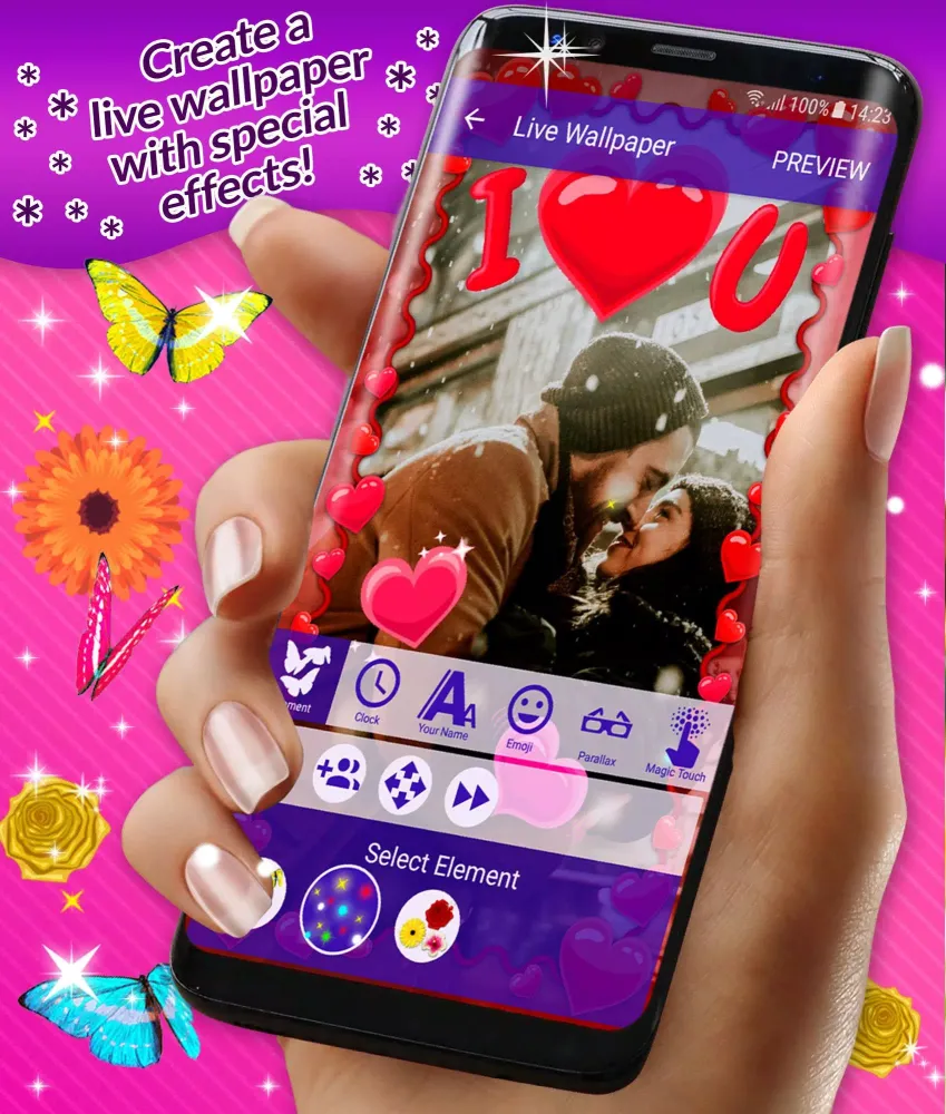 - Live Wallpaper: Create stunning live wallpapers with moving elements like flowers, butterflies, stars, and magic touch effects. Customize clocks, floating emoji, and text animations in various styles and colors.