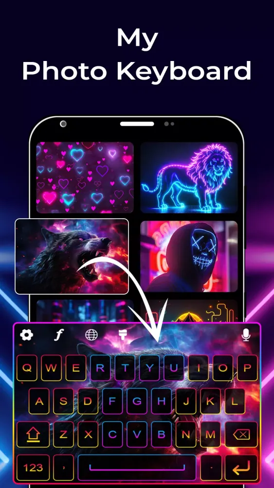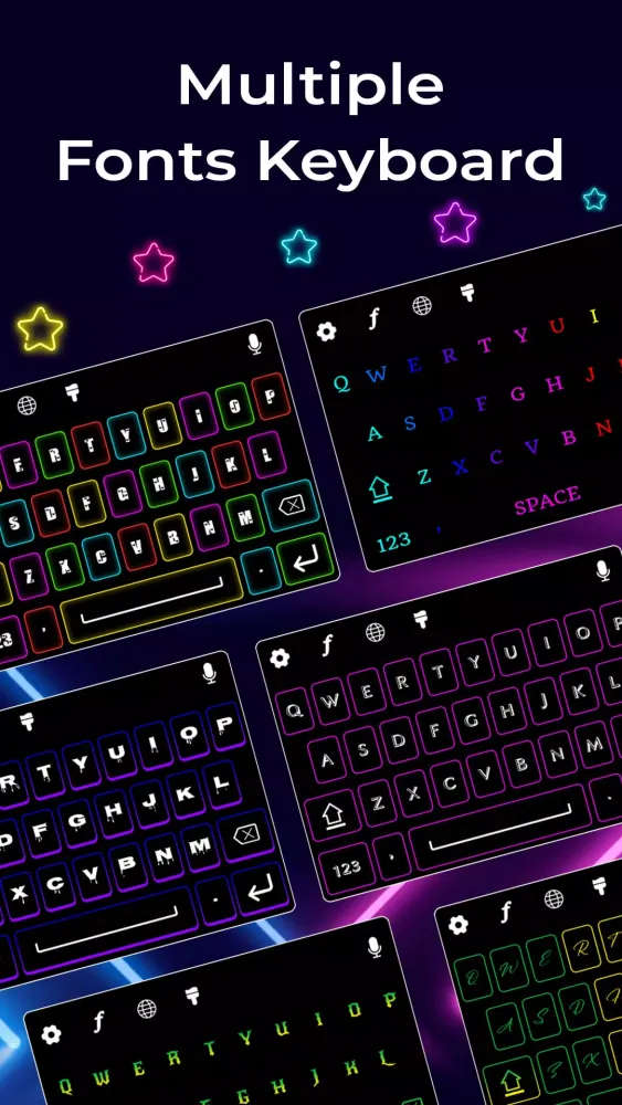 Effortlessly transform your phone's keyboard into a dazzling display of LED effects, backlit options, and neon lights. Whether you prefer the tactile feel of a mechanical keyboard or the vibrant glow of RGB lighting, Neon Led Keyboard & Themes offers it all. Customize your keyboard with unique fonts, thousands of emojis, emoticons, animated GIFs, colorful neon text effects, and animated keyboard backgrounds. Enjoy a smooth and responsive typing experience tailored just for you.