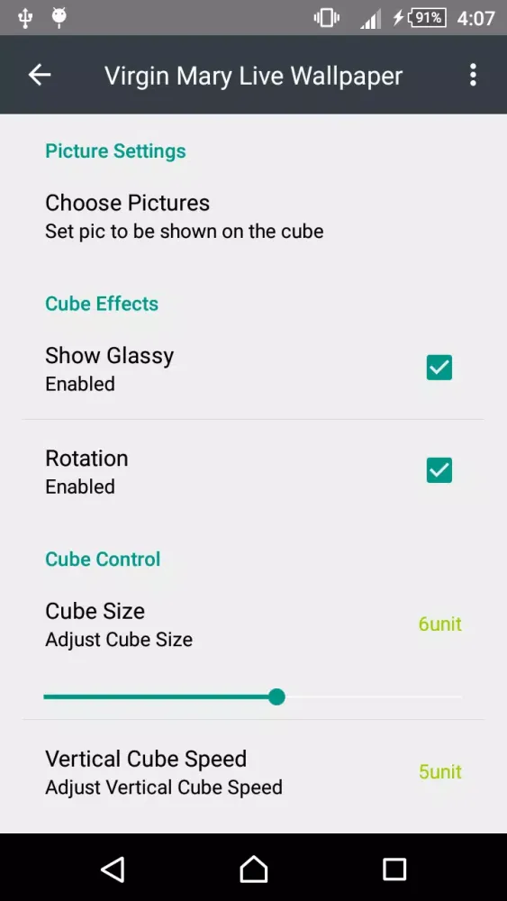 The app features a rotating 3D photo cube that showcases six different images from the selected image set. The cube reacts to touch gestures, providing an interactive and engaging visual experience. As you swipe through your home screens, the cube changes its rotation, creating a dynamic and soothing environment.