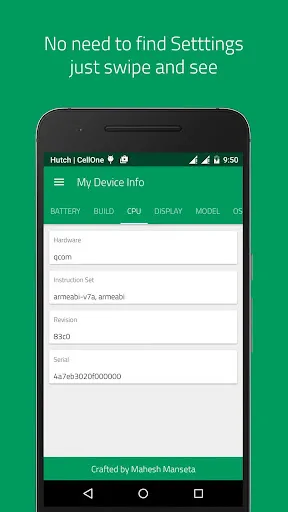 No need to check settings and find them one by one in different module on your smartphone, rather download this app and check all the Device Info at one place, just swipe and check, no boring navigation.