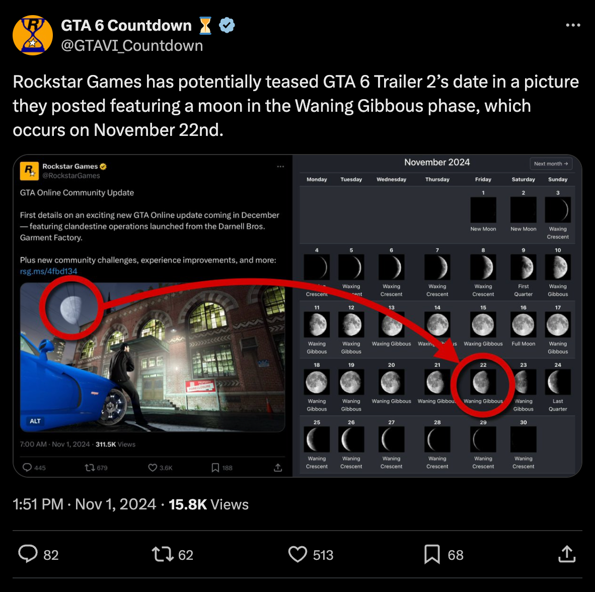 Earlier this month, a new promotional image for GTA Online caught the attention of fans experiencing GTA 6 withdrawal. The image prominently features the moon in its Waning Gibbous phase, which occurs on November 22 this month.