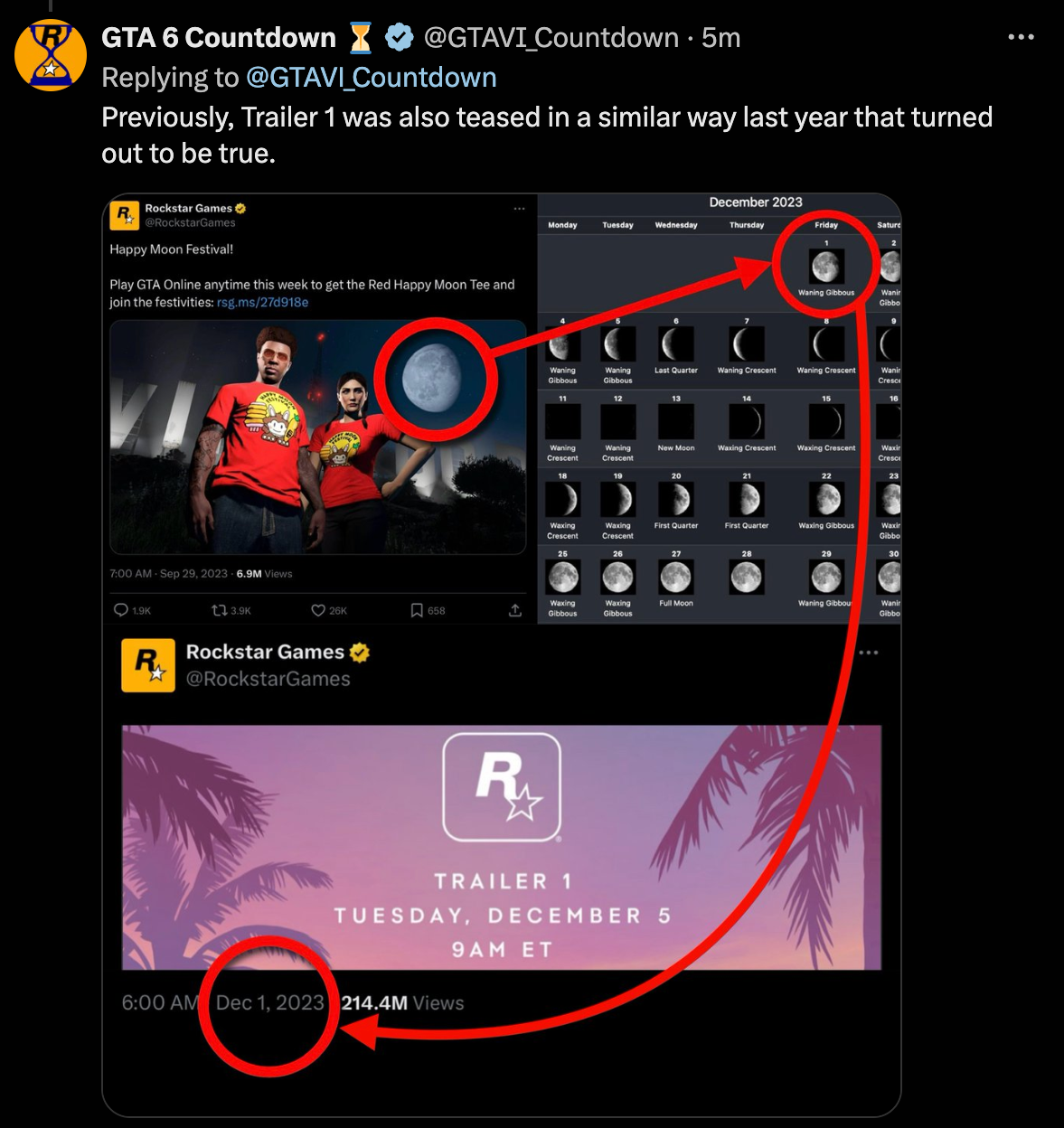 The reason Grand Theft Auto fans are paying close attention to the moon is that the first GTA 6 trailer was released during a Waning Gibbous moon as well, and it was also hinted at in promotional material for GTA Online beforehand. This has led to speculation that a similar teaser might be in play for the upcoming trailer release.
