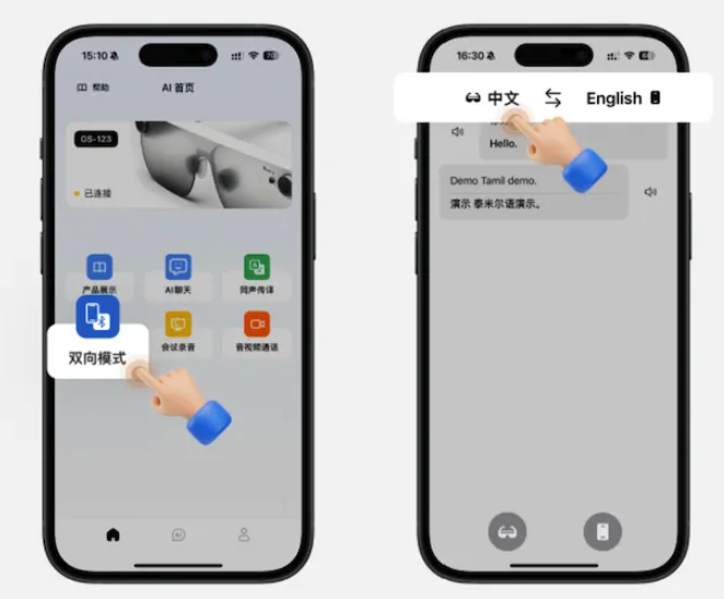 • A speaks Chinese via phone → B hears English through smart glasses