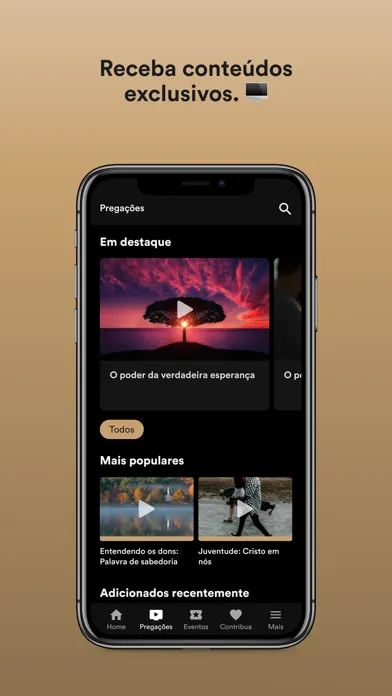 - Siga a agenda e fique por dentro de tudo que acontece na igreja, inscreva-se em eventos e tenha seus ingressos sempre com você.