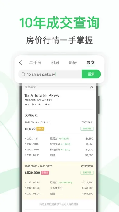 - 输入地址,即刻查询目标房源的挂牌历史与成交价格 ;