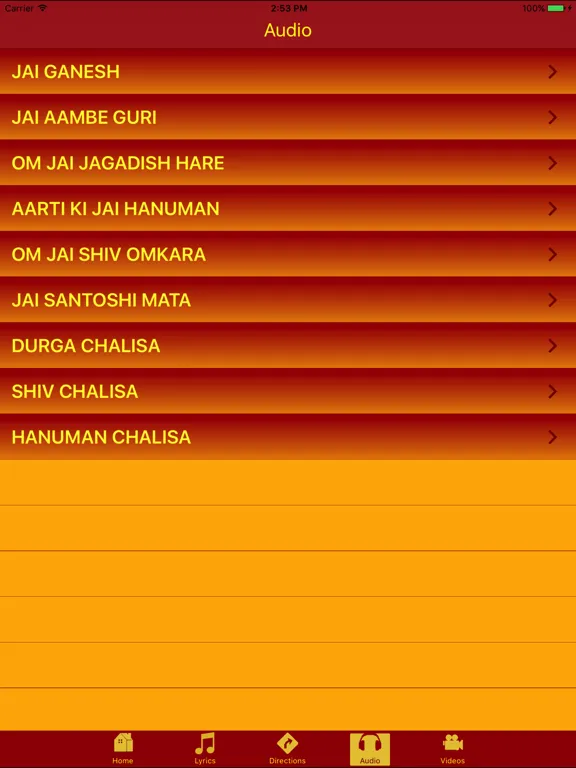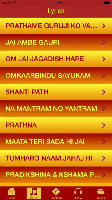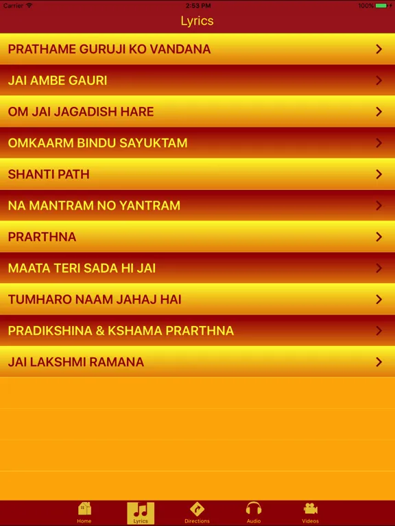 The lyrics and audio pages provide text and audio versions of the religious songs used during daily services.