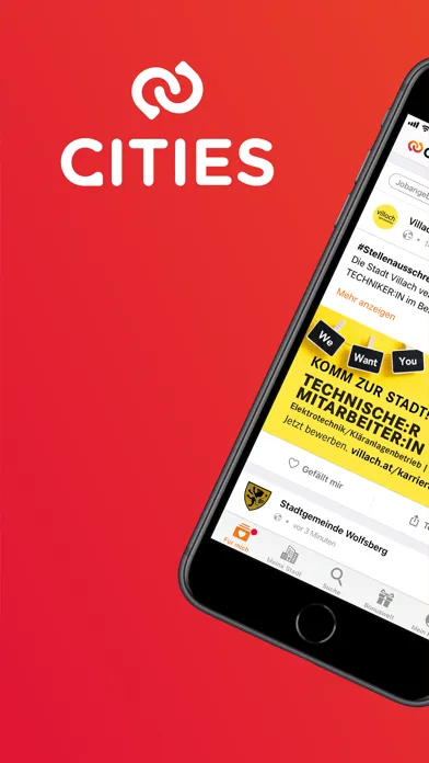 CITIES ist deine Chance, direkt mit deiner Stadt oder Gemeinde in Kontakt zu sein. Verbinde dich mit all den regionalen Betrieben und Vereinen, die du magst und bleibe in Kontakt. Erhalte Ankündigungen und Updates deiner Stadt oder Gemeinde und entdecke regionale Veranstaltungen in dem auf dich abgestimmten Feed. Außerdem findest du alle Informationen die du brauchst, egal ob Öffnungszeiten, Kontakte, Müllkalender – zentral gesammelt in einer App.