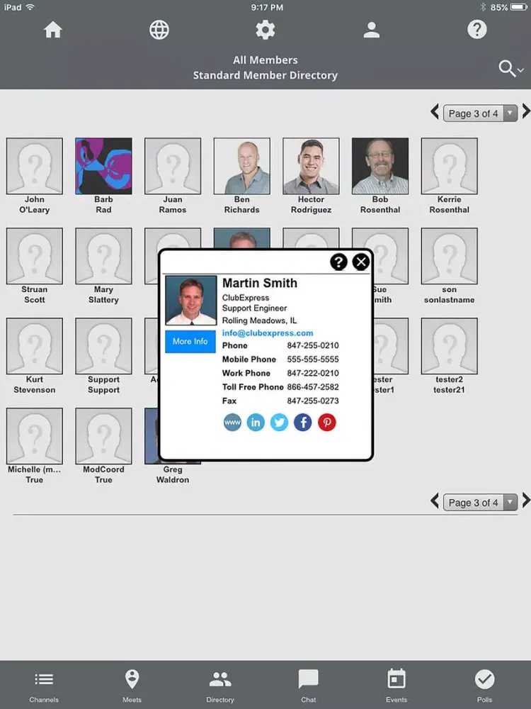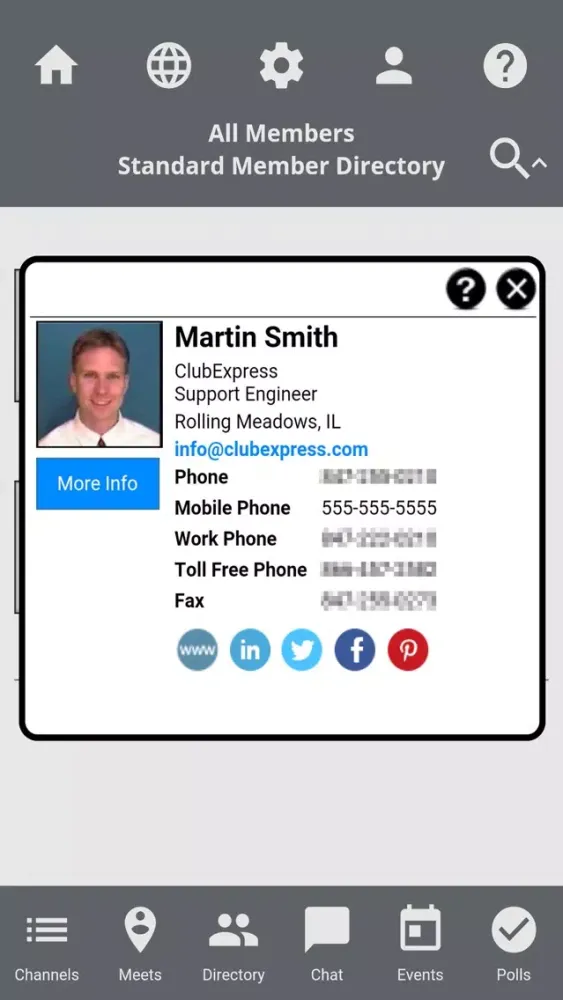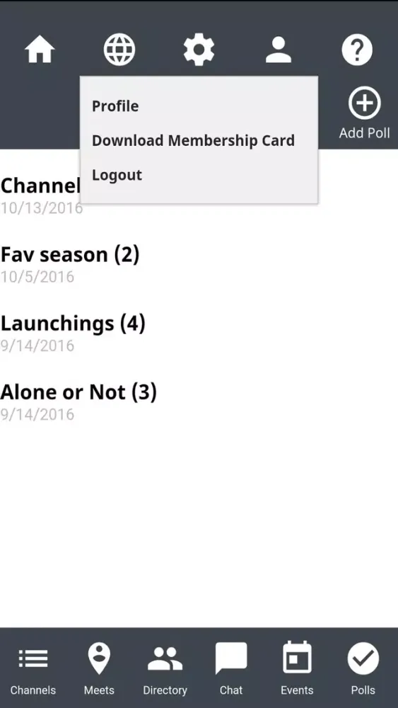 This application provides access to the membership directory, chat feature, member calendar events, polls and surveys, membership card, and website content.